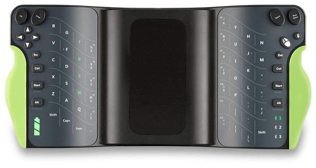 computers and AR/VR technology. Visual cues on the front allow non-touch-typists to locate the keys on the back using